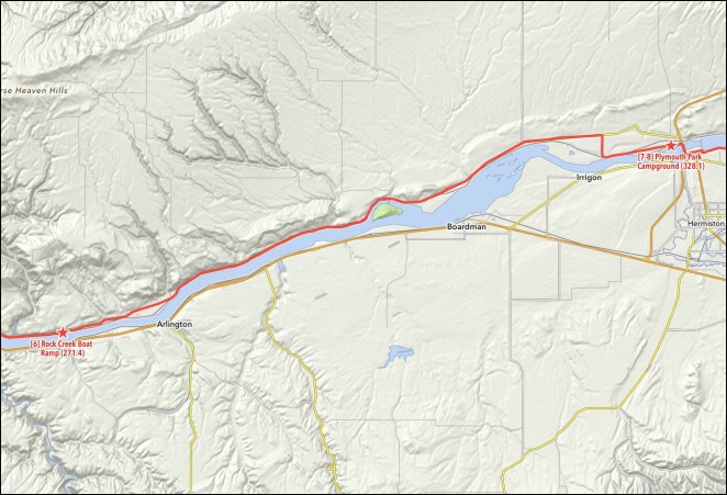 General description of route: Take Washington State Highway 14 east from Rock Creek Boat Landing to just before entering Plymouth, WA, then local roads to Plymouth Park Campground, WA