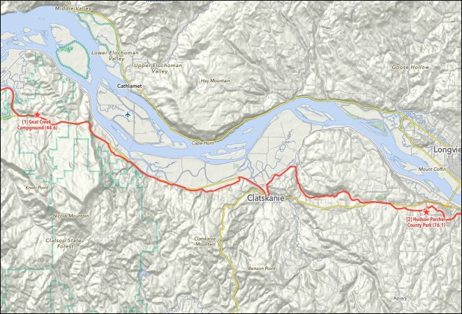 General description of route: Take U.S Route 30 and parallel local roads east from Gnat Creek Campground, OR to Hudson-Parcher County Park, OR