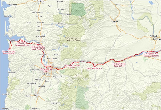 Cities and towns on route: Portland, OR, Gresham, OR, Fairview, OR, Troutdale, OR, Springdale, OR, Corbett, OR Cascade Locks, OR