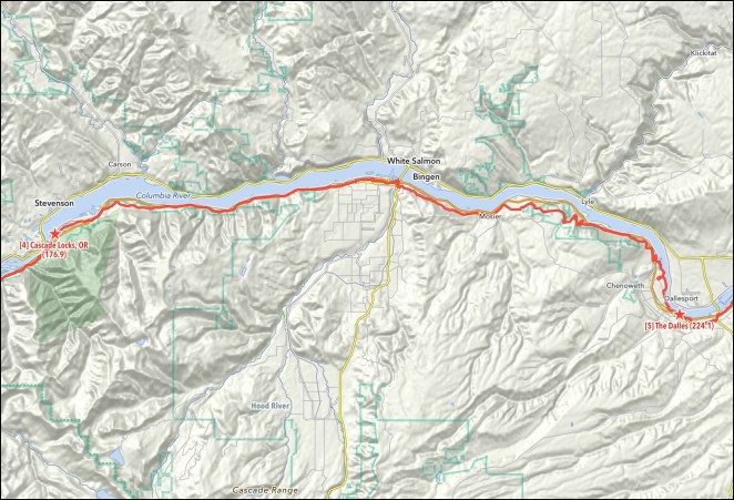Cities and towns on route: Cascade Locks, OR, Hood River, OR, Mosier, OR, The Dalles, OR