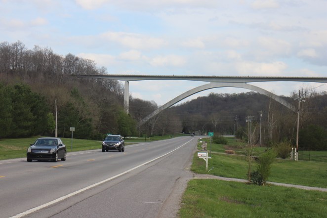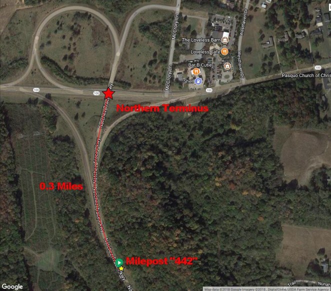 I have ridden my bicycle past this milepost as recently as Wednesday of this week, but if you want to verify where it is for yourself if you don’t believe me it is easily visible on the Google maps “street view.” From there headed to the red star at the center of the Tennessee State Route 100 bridge the distance is three-tenths of a mile/one-half a kilometer. Even if you include the additional distance around the longest northbound exit ramp (to westbound Route 100, you only come up with a total of seven-tenths of a mile/1.1 kilometers. It is thus, based on the location of Milepost 442, impossible to travel 444 miles on the Natchez Trace, much less 445 miles. Others have also spotted this problem [link].