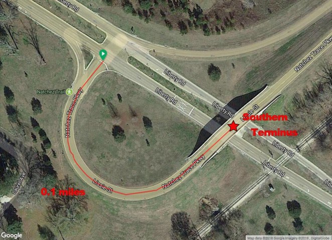 Maybe it’s because the last two sections of the Trace- the final eight miles or so to the Southern Terminus (“ST”) at Liberty Road in Natchez and the 14.3 miles/23 kilometers around the northwest quadrant of Jackson, Mississippi- were built many years after the majority of the remainder of the NTP, but there is a significant discrepancy between the official mile markers, which are supposed to reflect the actual distance measured from the ST to any given point along the Trace, and the true actual distance to any given point. How do I know the “actual” distance? By creating a GPX track based on Google Maps’ satellite view images of the NTP starting at the centerpoint of the bridge over Liberty Road, which I use as the ST, and ending at the centerpoint of the bridge over Tennessee State Route 100 near Nashville, which is the Northern Terminus (“NT), that’s how. This generates, when imported into a mapping program that calculates distance- I use Ride with GPS- a distance of 445 miles/716 kilometers (and, as noted above, a tiny bit of mileage “change,” but that doesn’t affect any of the distance measurements in between).