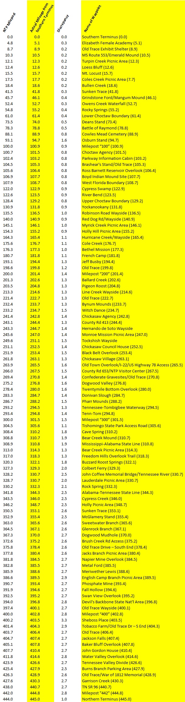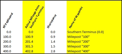 As you can see, the discrepancy increases fairly consistently as you head north. The NTP mileposts and published mileage numbers, in short, are not correct. None of them. And that’s a fact.