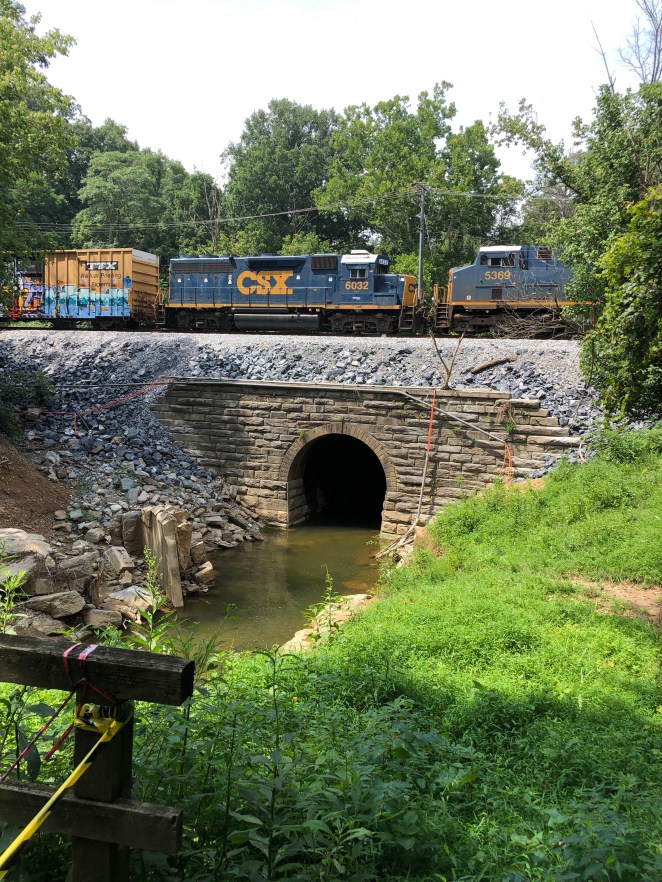 I could see to the Canal side of the Towpath a railroad line crossing a culvert about 200 feet/60 meters away. It had a very long freight train crossing at the time.