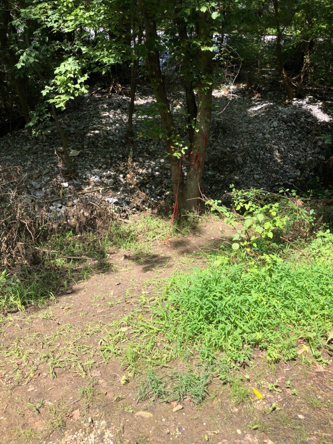 This is such a bad choice, in fact, that I’ll take a moment and go over in detail why you shouldn’t do it. First, you certainly shouldn’t go back up the Towpath about 10 yards/meters or so and look for where some ballast from the railroad line had spilled down into the old canal bed. There could be snakes down there or you could badly scratch the paint on your bike on a dead tree limb.