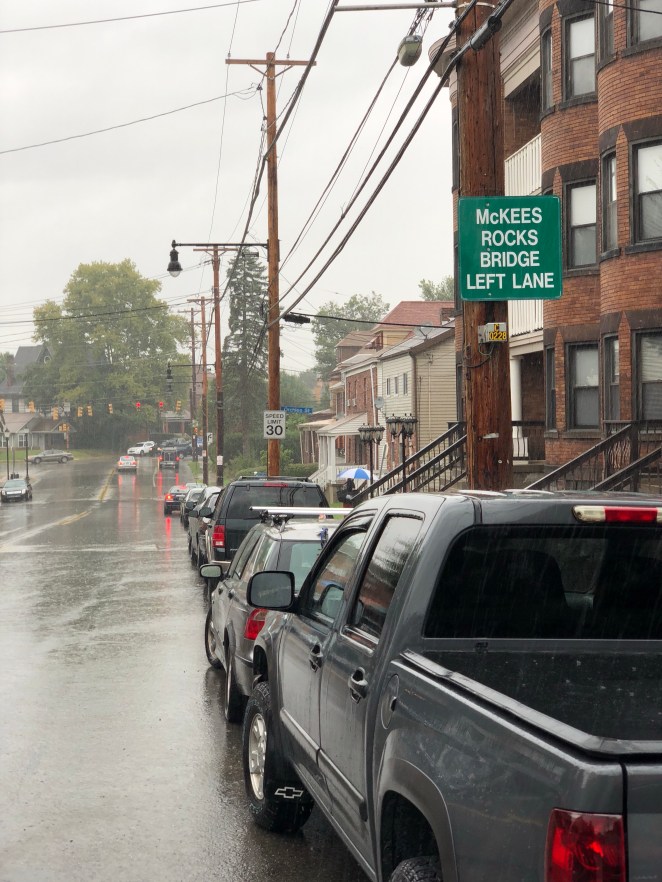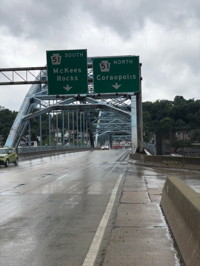 When the bike path ended I turned away from the bank of the river and headed up- you guessed it- a very large hill. I used neighborhood streets to gain about 250 feet/75 meters in elevation in about half a mile/800 meters to get on the approach to the McKees Rocks Bridge and cross the the south bank, where my route would shortly continue up a nice flat island for several miles/kilometers down the river to the wonderfully named. Coraopolis. Just as I started up it began to pour.