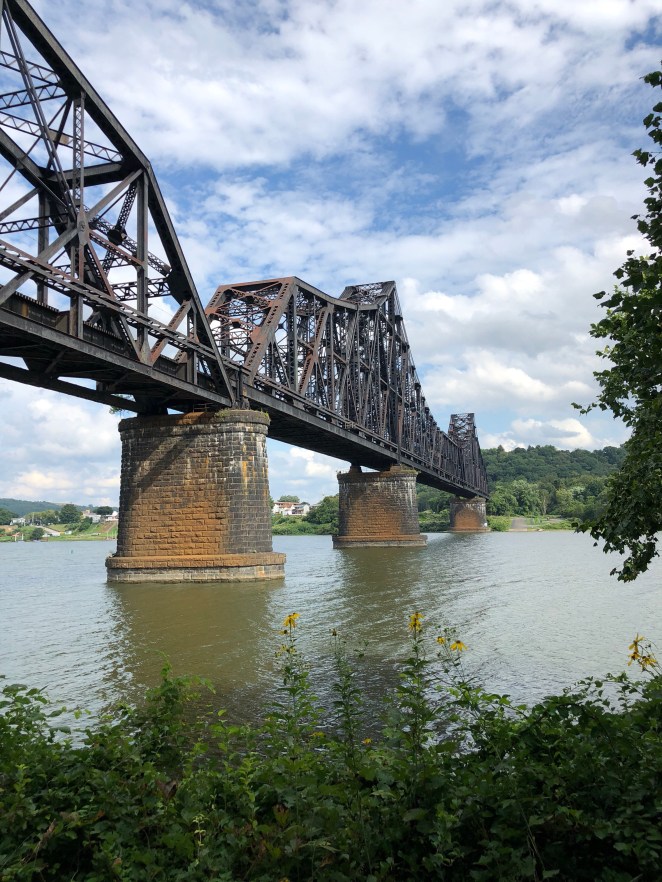 I struggled- there is no other way to put it- up what must have been about a 12% grade into the center of East Liverpool and turned left headed for what was marked on my map as the Newell Bridge into West Virginia. It was nearing dusk and threatening rain, and I still had about ten miles/16 kilometers to go to reach Tomlinson Run State Park, my destination for the night. I rolled up to the bridge and, I can’t help saying it, my jaw dropped.