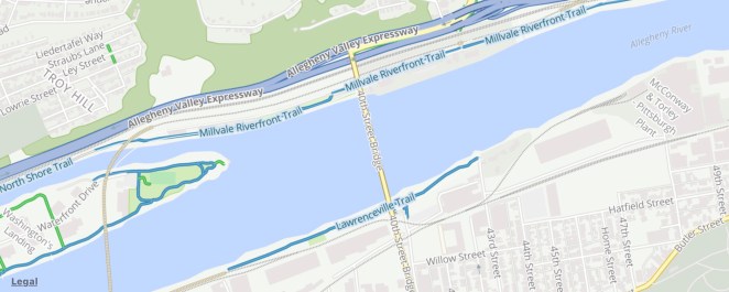 This choice of routing gave me the opportunity to pick up what quickly became the North Shore Trail, my intended way out of Pittsburgh to the west.
