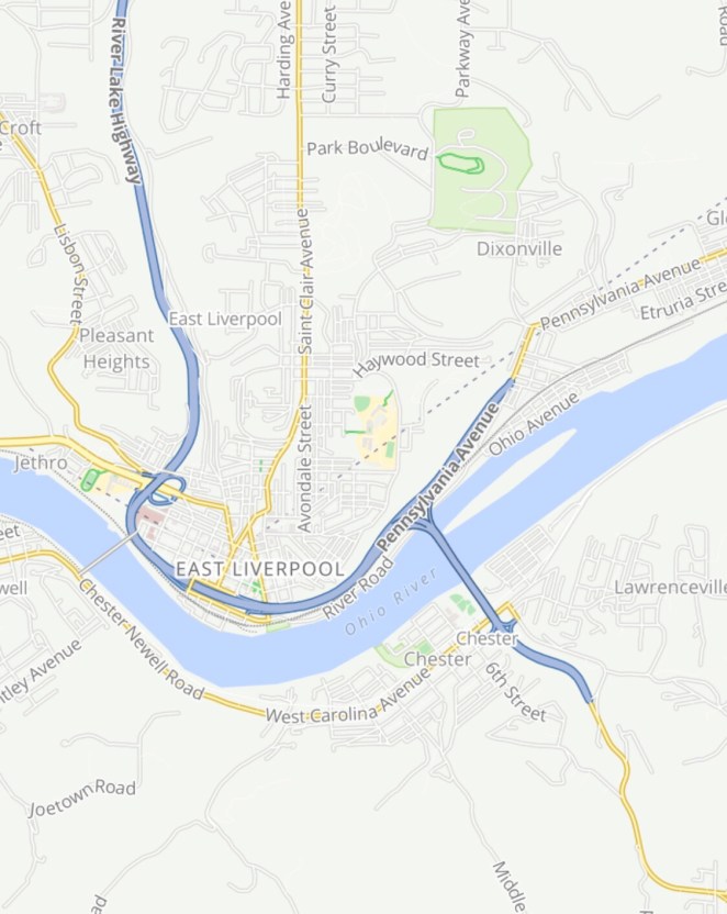 Now in Ohio, it was just a couple of miles/kilometers ride to the city of East Liverpool- a sort of down on its luck-looking place with an amazing freeway system that seem designed for a much larger urban area.