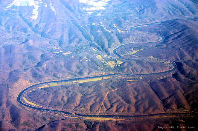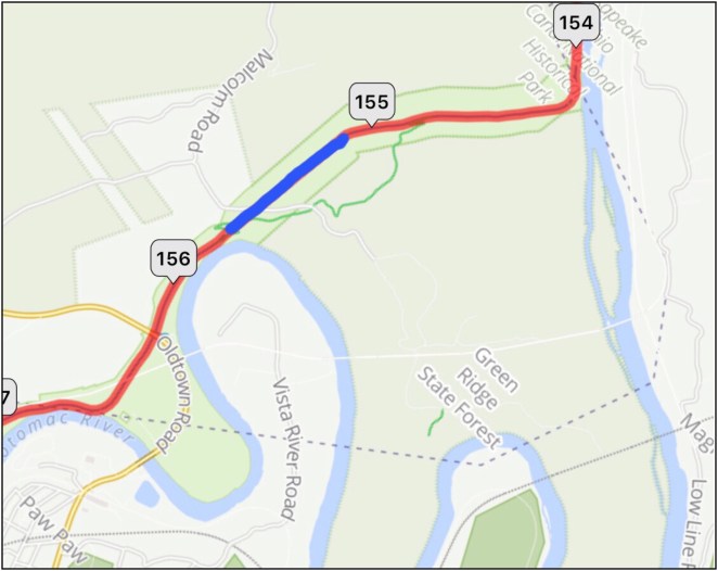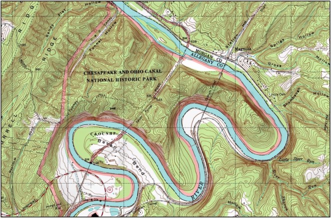 The Canal begins its approach to the tunnel by turning inland from the north bank of the Potomac River at Mile 154.3.