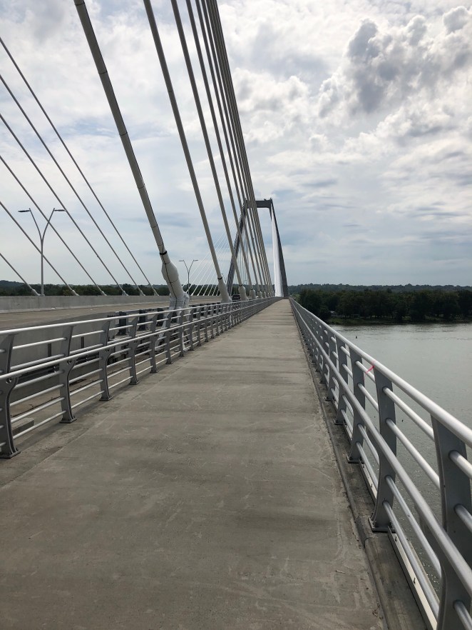 Now, I can’t point to evidence in anything Abbey wrote that would support a conclusion that he ever rode a bicycle. I will note, though, that bicycles are one of the methods of locomotion he speaks of with approval in his rant about “Industrial Tourism” found in Desert Solitaire. So, finessing the point, what would Ed have done on finding these barriers thrown up without warning barring his way onto the bike path along the brand new Indiana State Route 265/Kentucky State Route 841 East End Bridge over the Ohio, presuming that riding across the bridge was one of the major reasons (admittedly among many other major reasons) he would have cycled such a long way to get there?