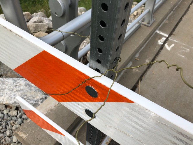 There was a twisty little piece of wire tying the barricades to the fences on the side of the path.