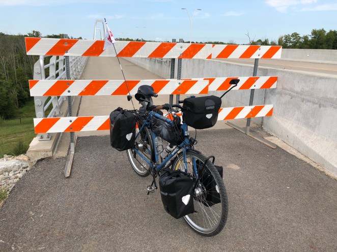 The bikeway was closed during the week for a full month to allow the work to be completed. The workers were, I’ll admit, pretty stony-faced when I rode up to them and asked if I could slide my bike around their truck. I told them about my trip- I think they were on a lunch break. One of them looked at me and said, “Well, you’re here, aren’t you.” I admitted that I was. He said, “Just make sure you put the wire back at the far end.”